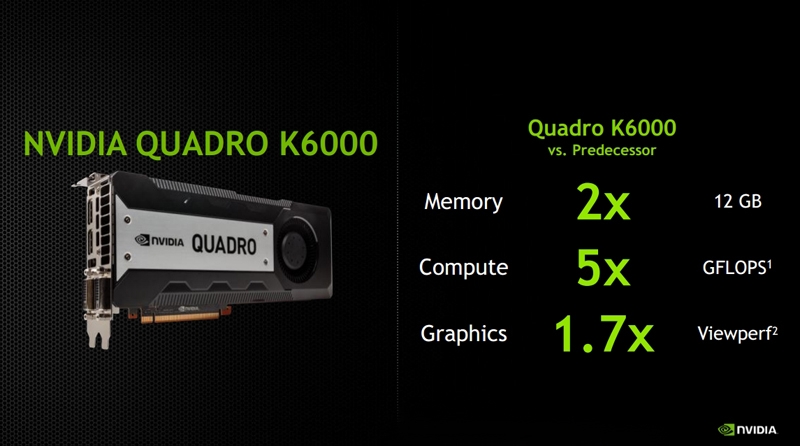Отличная новость для самых взыскательных пользователей, профессионально занимающихся компьютерной анимацией и 3D-моделированием! Пресс-служба компании NVIDIA анонсировала выпуск, как утверждается, самой мощной на сегодняшний день одночиповой видеокарты для рабочих станций, а именно модели Quadro K6000 на передовой архитектуре Kepler. В основу новинки лёг созданный по 28-нм проектным нормам чип GK110 с максимально возможным для данного GPU количеством активных ядер CUDA, равным 2880 штукам, а также с 256 текстурными модулями (TMU) и с 48 блоками растеризации (ROP). Модель имеет на борту аж 12 Гбайт памяти GDDR5 с полосой пропускания 288 Гбайт/с. По объёму это в два раза больше, чем у ускорителя Quadro 6000, являющегося флагманом среди профессиональных графических адаптеров NVIDIA на архитектуре Fermi. Видеокарта Quadro K6000 изготовлена на чёрной печатной плате под шину PCI Express 3.0 x16 и оборудована двухслотовым кулером с одним вентилятором. Её заявленная производительность составляет 5,2 TFLOPS. При этом уровень TDP равен 225 Вт.Из прочих технических характеристик новинки известно то, что её набор коммуникационных возможностей состоит из выведенных на заднюю панель двух портов DVI и пары выходов DisplayPort. Ожидается, что к осени текущего года собственные версии Quadro K6000 представят компании PNY Technologies, ELSA Technology и Leadtek Research, а первыми новинку применят в своих продуктах такие производители, как Dell, Hewlett-Packard и Lenovo.
